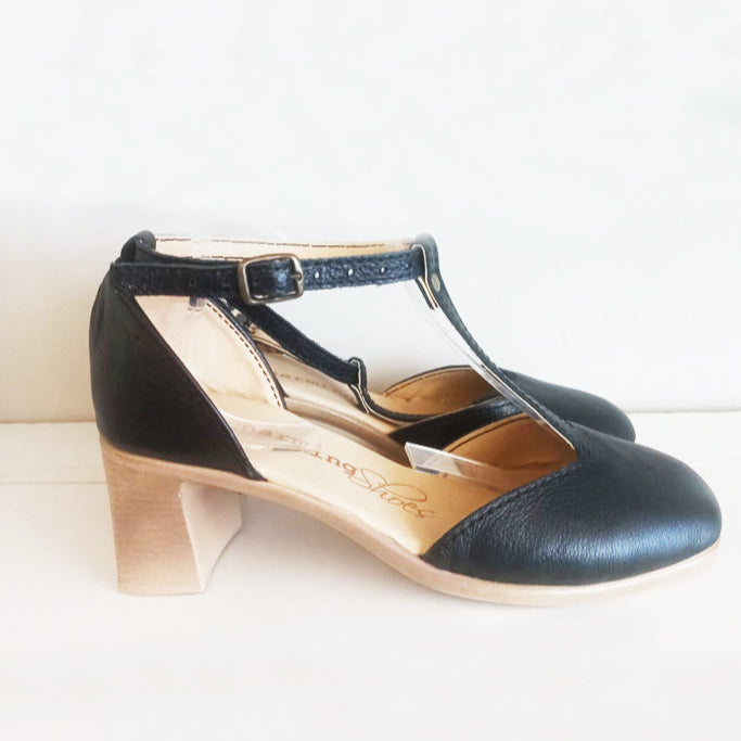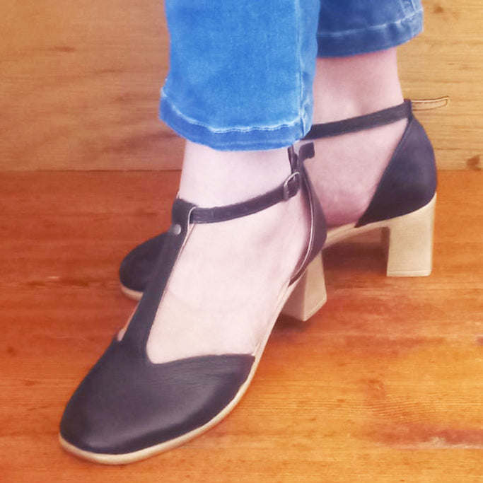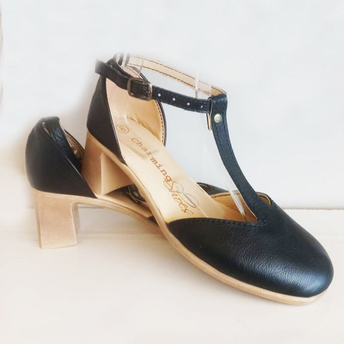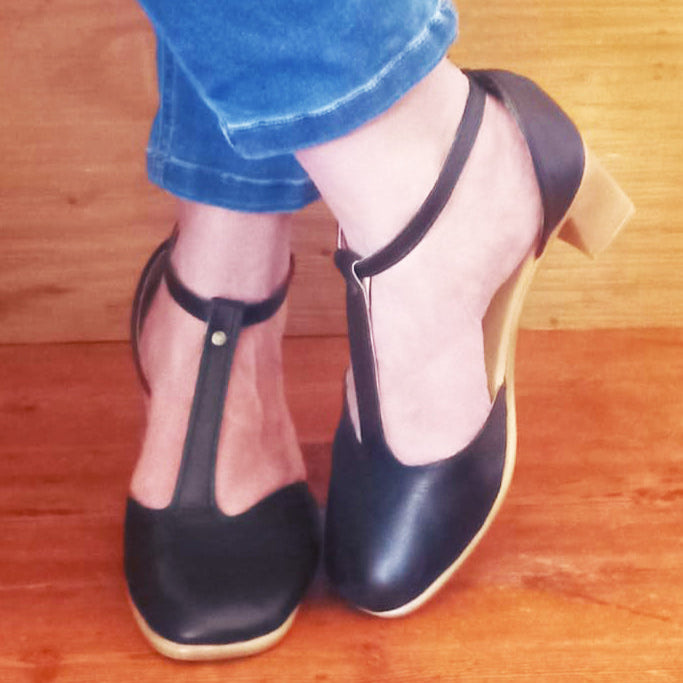 Genuine authentic leather closed toe low heels with a beautiful 'T' design for a stunning vintage look to match your wardrobe. These heels supports the bridge of your feet & are super comfortable.