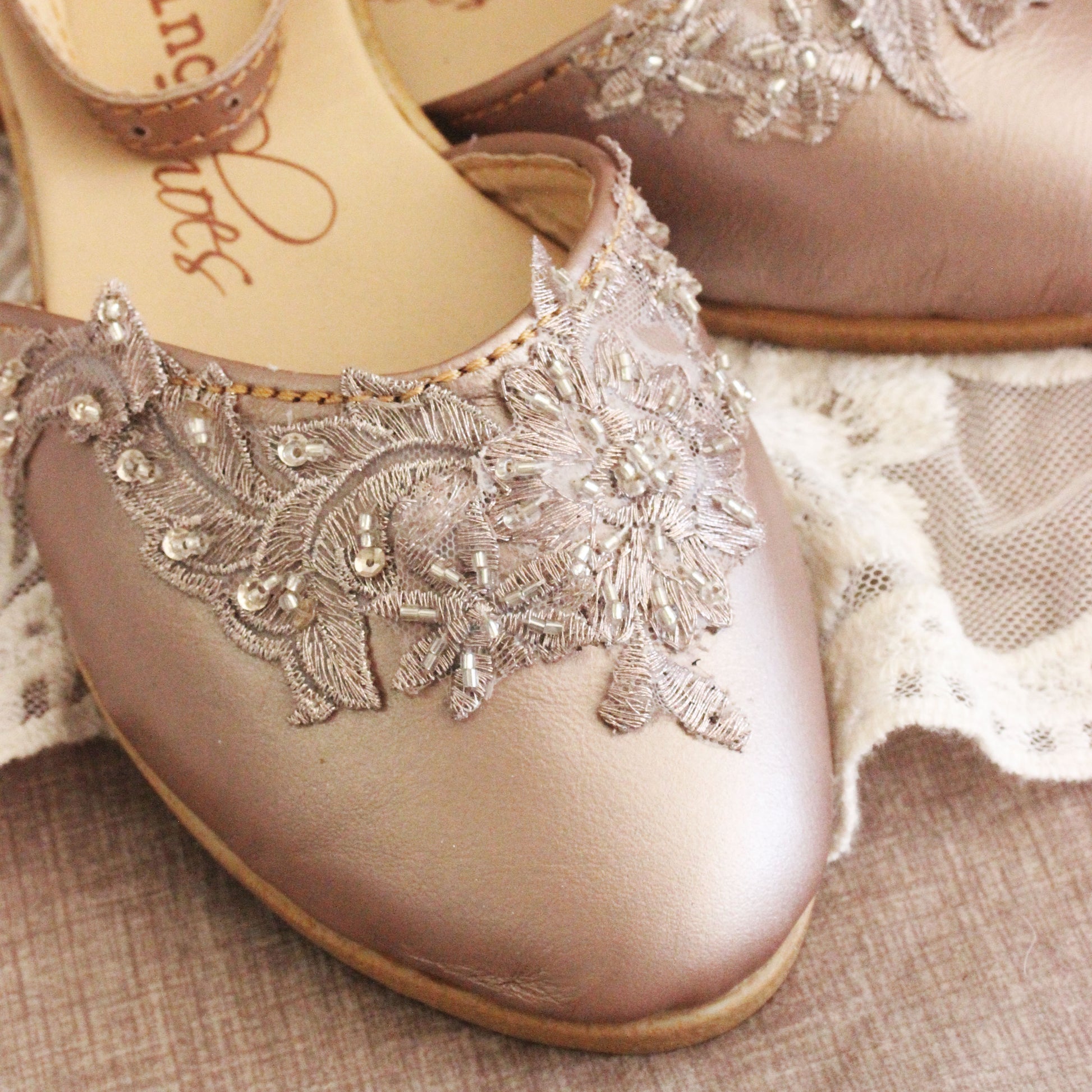 Genuine authentic handcrafted in a soft rose gold pink Shiduli ox leather closed ankle strap design covered with a touch of detailed lace on close toe design.