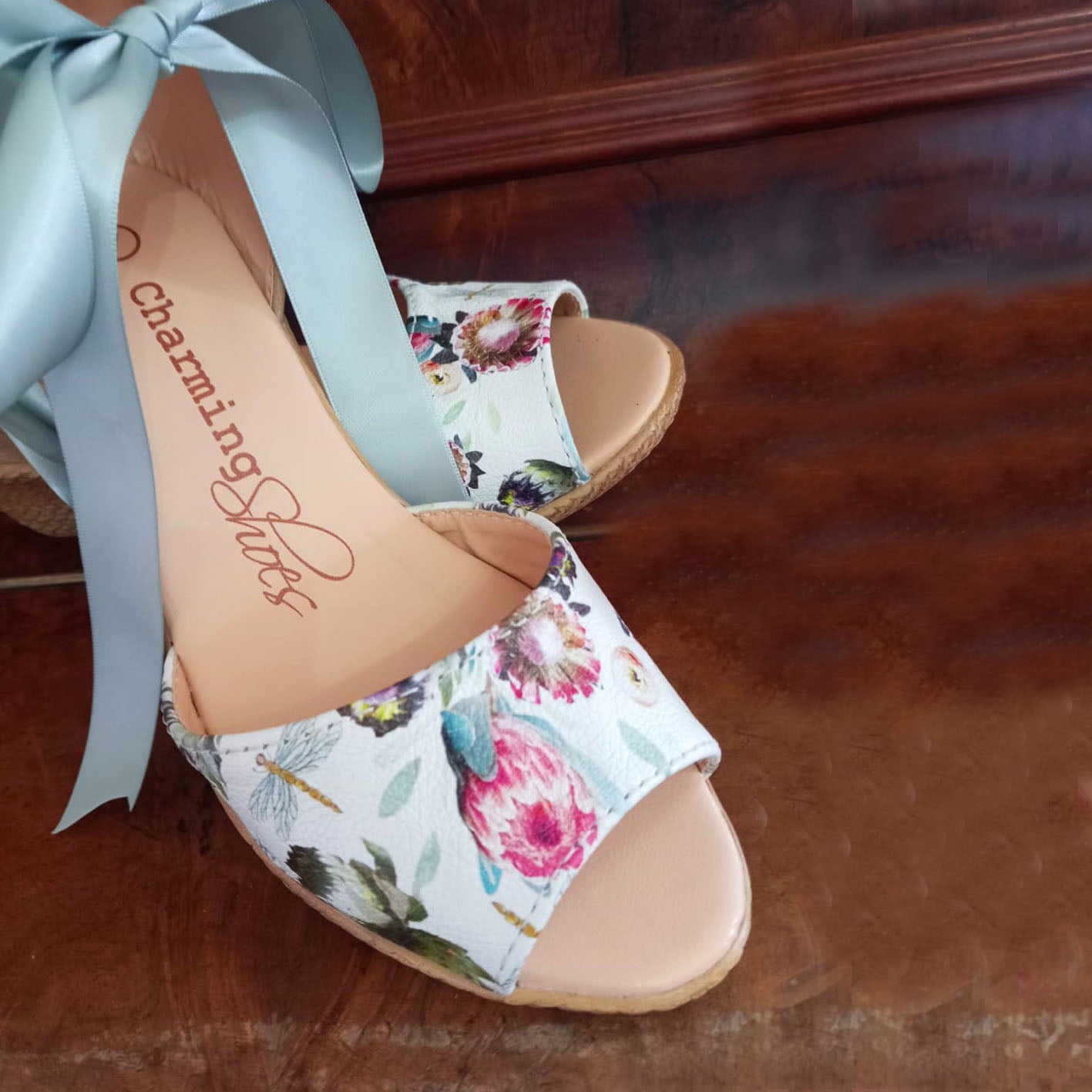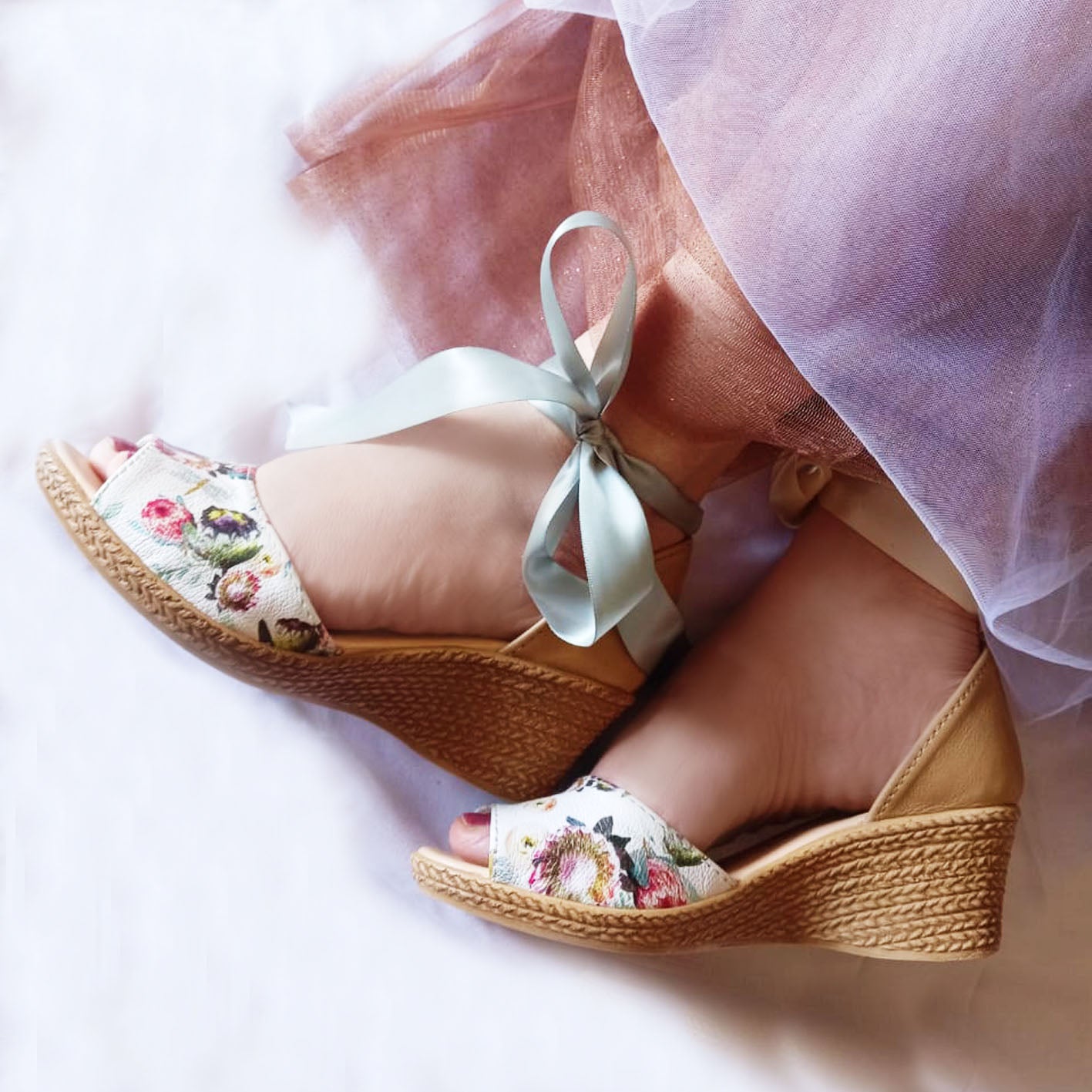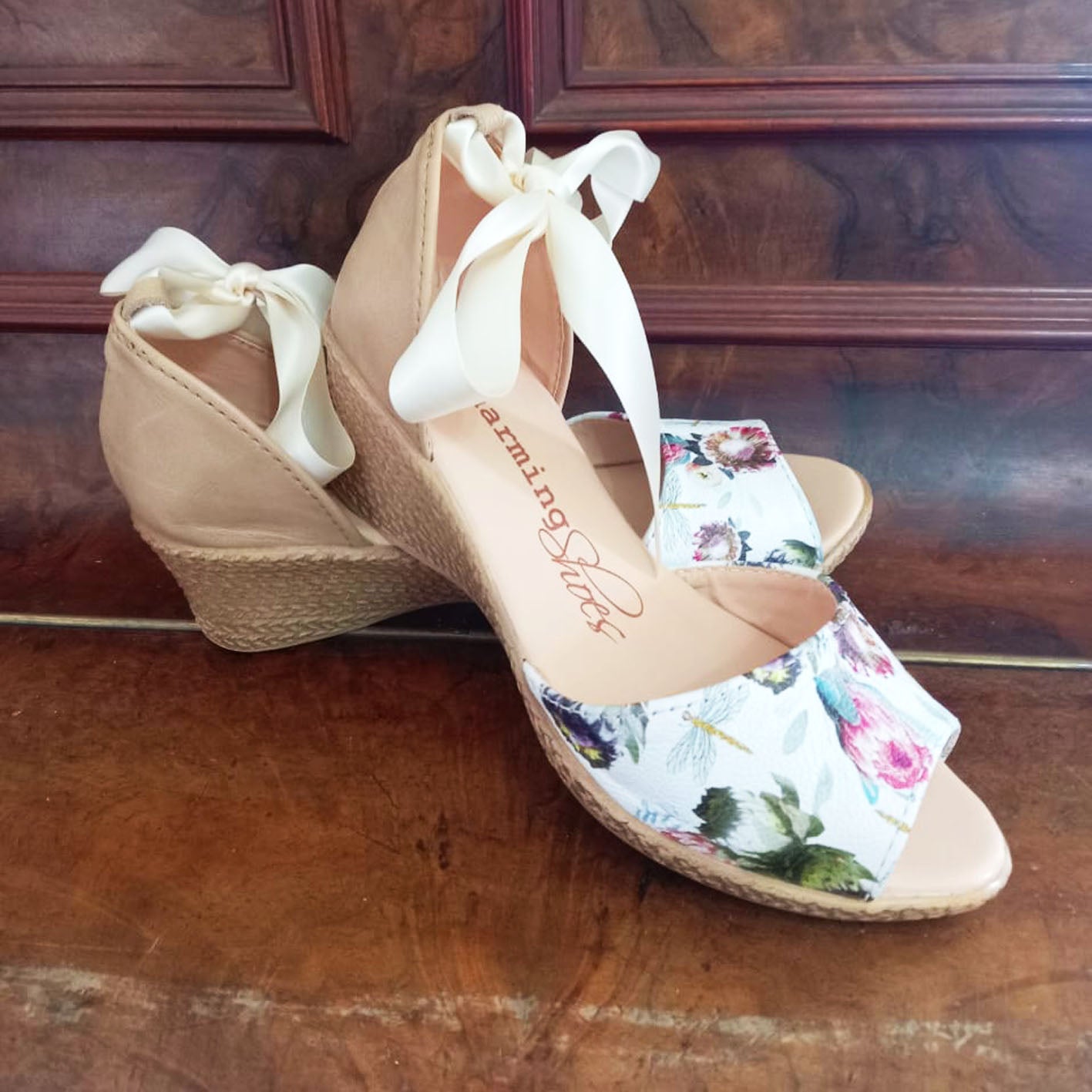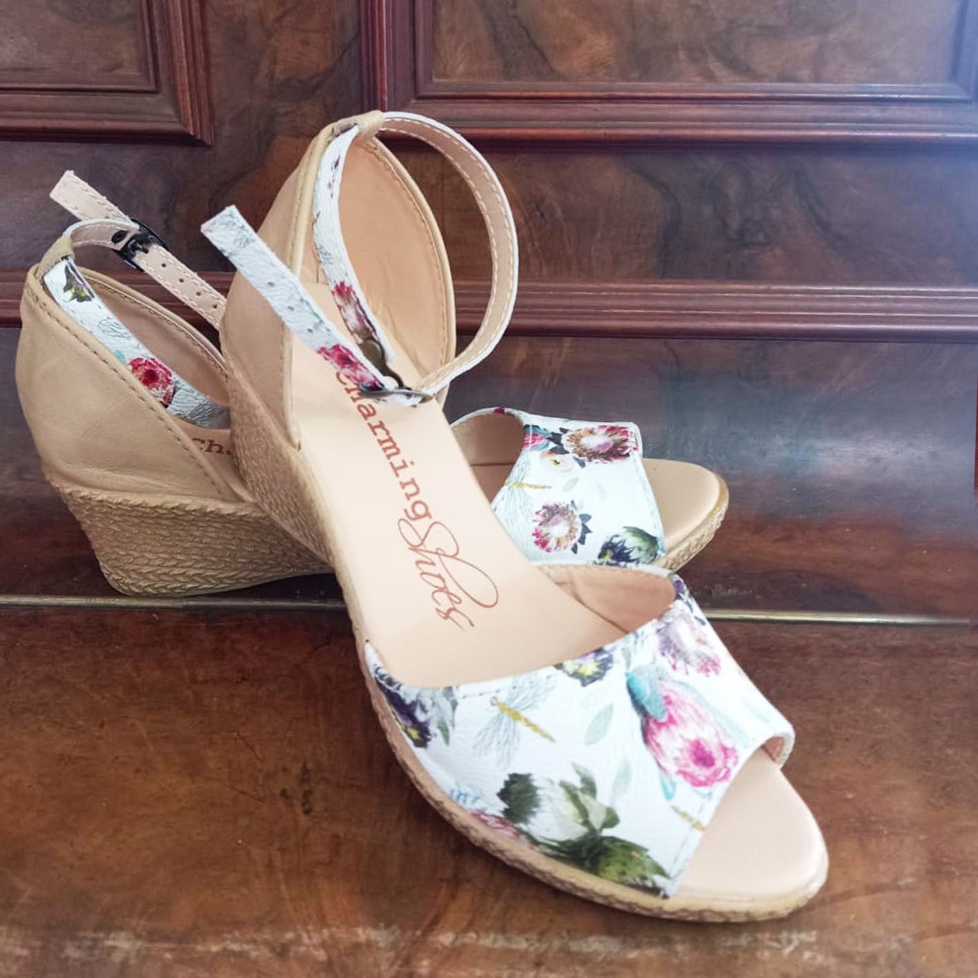 These are our brand new open toe ankle strap design on printed leather with a matching beige closed heel wedge and is a must-have classic for this warmer seasons. This is a very unique and individual, comfortable style. This design comes only with standard ankle leather straps. You can change it with your own color ribbon to suite your personal taste to go with your outfit.
