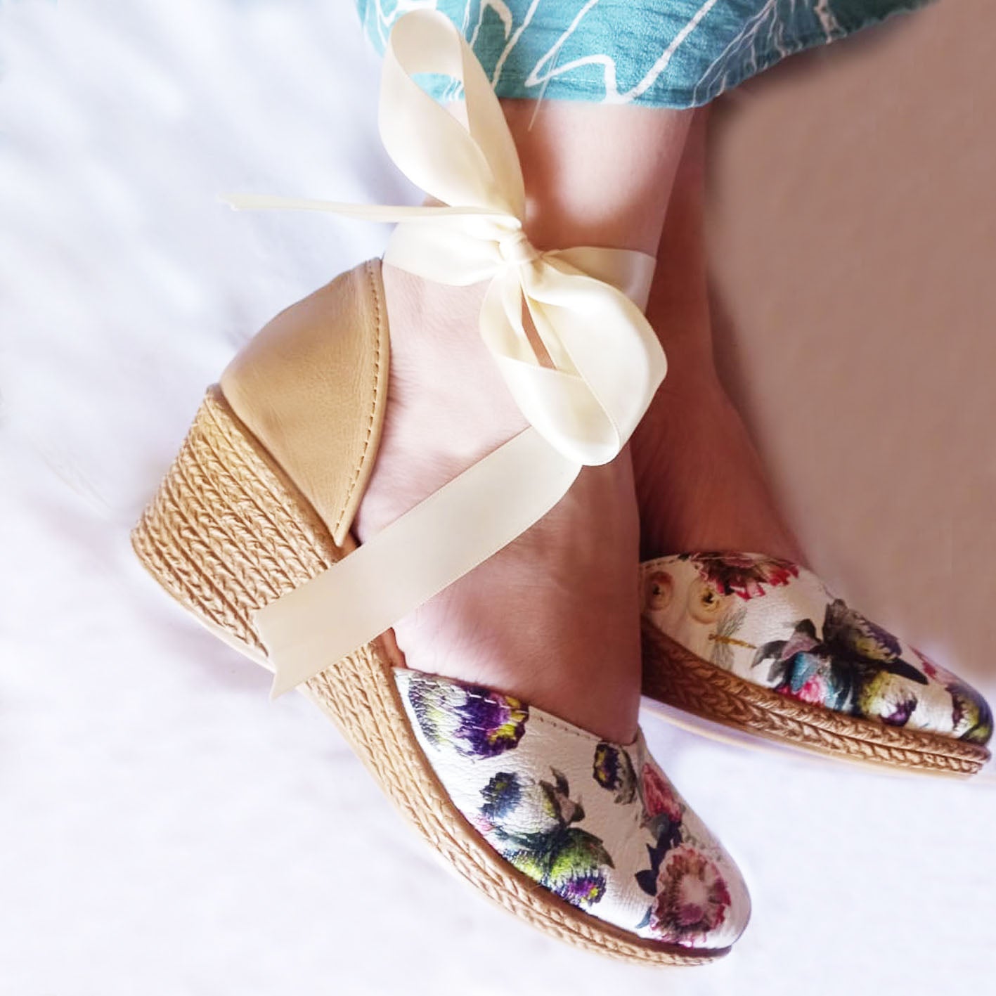 These are our stunning floral protea print on leather ankle strap design on a beige closed heel wedge and is a must-have classic for special occasions as well as non formal wear.